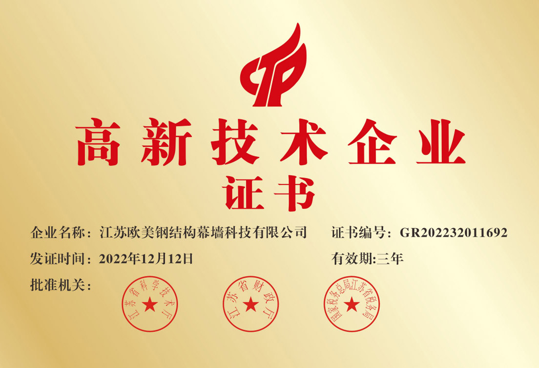 江蘇歐美鋼結(jié)構(gòu)幕墻科技有限公司鄭州分公司是國家建設(shè)部核發(fā)的鋼結(jié)構(gòu)、網(wǎng)架工程專業(yè)承包一級(jí)資質(zhì)企業(yè),是專業(yè)網(wǎng)架設(shè)計(jì)、制造、安裝企業(yè)。公司為中國鋼結(jié)構(gòu)協(xié)會(huì)會(huì)員單位,中國建筑金屬協(xié)會(huì)會(huì)員單位。國家網(wǎng)架及鋼結(jié)構(gòu)產(chǎn)品質(zhì)量監(jiān)督檢驗(yàn)中心中心質(zhì)量認(rèn)定信得過單位。